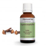 Eugenia caryophyllus “Originario de las islas Molucas, este árbol de 20 metros de altura crece en los suelos tropicales marítimos drenados. Sus hojas están enfrentadas, y son coriáceas y perennes. Las flores, de un blanco rosado, están agrupadas en pequeñas inflorescencias compactas y ramificadas. Aceite Esencial de Clavo de Especias de Pranarom es un producto indicado en caso de infecciones bacterianas y respiratorias: sinusitis, bronquitis, etc. También actúa sobre la micosis, el herpes zóster, el reumatismo, las infecciones bucales.