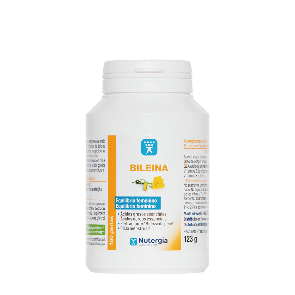 Bileina de Nutergia está compuesta por aceite de onagra 100% obtenido por simple presión mecánica en frío. Además, se le añade vitamina E natural para conservar todas sus virtudes. El consumo de este aceite garantiza una toma de ácidos grasos poliinsaturados, beneficiosos para la mujer, en particular en caso de desórdenes relacionados con el ciclo y a nivel cutáneo. Propiedades Bileina de Nutergia es un suplemento de aceite de onagra de máxima calidad al que se añade vitamina E para conservar todas sus propiedades. El uso de este aceite garantiza una toma de ácidos grasos poliinsaturados omega-6 (ácido linoléico y ácido gamma-linolénico, GLA). La enzima delta-6-desaturasa es la encargada de producir GLA a partir de otros ácidos grasos. Pero, algunos factores como el estrés, consumo de azúcares rápidos o carencia de algunas vitaminas (B6 y B8) pueden afectar a su correcto funcionamiento. Por eso, Bileina de Nutergia resuelve esto para lograr un equilibrio en el balance PG1/PG2. Beneficios Bileina de Nutergia está especialmente indicado en casos de piel seca o para aquellas mujeres que sufren incomodidades durante su ciclo menstrual. Advertencias No se han establecido contraindicaciones para este suplemento, sin embargo, existen algunas advertencias que pueden tenerse en cuenta: Debe mantenerse fuera del alcance de los niños. No sustituye a una dieta variada y equilibrada. No se debe superar la dosis diaria recomendada. Debe almacenarse en un lugar fresco y seco.