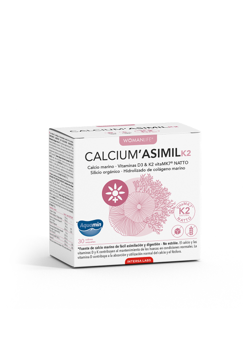 AQUAMIN™ es un complejo multimineral a base de algas rojas (Lithothamnion) que crecen en aguas poco profundas cerca de la costa de Islandia. El exoesqueleto de estas algas está constituido por: 32% de calcio, 2% de magnesio y 72 oligoelementos. Su proporción en calcio lo hace comparable a cualquier otra fuente de calcio disponible en el mercado, pero AQUAMIN™ proporciona, además, magnesio y un cocktail natural de oligoelementos que le proporcionan un mayor número de beneficios. Además, AQUAMIN™ está 100% basado en algas cose- chadas bajo licencia en la costa noroeste de Islandia. Además, su producción es sostenible, puesto que sigue prácticas estrictas y respe- tuosas con el medio ambiente, lo que hace de AQUAMIN™ un complemento apto para un consumidor cada día más consciente de la necesidad de proteger el planeta. Indicaciones: Prevenir y tratar los estados carenciales de calcio, vitamina D3 y vitamina K2 en mujeres en periodo de premenopausia y menopausia. Ayudar a proteger el hueso y a aumentar su densidad. Actuar como coadyuvante en caso de osteomalacia, osteopenia u osteoporosis. Mejorar la función motora, aumentar el rango de movimiento y las distancias para caminar en sujetos con osteoartritis de rodilla. Combatir el cansancio y la fatiga. Mejorar la calidad de la piel.